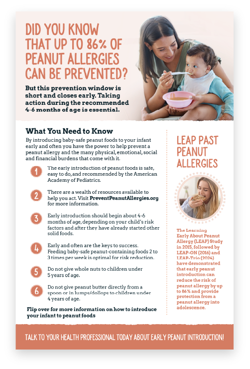 We hope these resources aide you when helping parents and caregivers put the power of early peanut introduction to work to prevent peanut allergies and the many burdens that come with them.